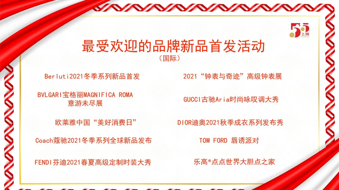 (三)供给质量更优。一是首发经济打造商业发展新动力。“2021全球新品首发季”推出“上海国际美妆节”“上海潮生活节”“时尚定制周”“上海红品节”以及品牌主题日系列活动等,150余个国际知名品牌和450余个引领性本土品牌发布、展示近3000款当季新品,助力全市中高端消费同比增长11.7%。引进各类首店旗舰店近100家,其中全球或亚洲首店2家,全国首店数量28家,数量和质量稳居全国首位。二是多“夜态”融合展现商业新魅力。首次发布6条夜生活推介官主题打卡线路,吸引3万余人参与打卡。首次发布夜生活节主题曲和微型纪录片,网络浏览量达3亿人次。88家重点监测企业6月夜间销售和客流同比分别增长22%和22%。美团数据显示,夜生活节期间,密室、到店餐饮、酒吧等夜间消费同比增长145%、50%、33%。市体育局首次推出“体育运动之夜”,超120万人参与,组织29个品牌、638家门店推出“六六健身大派送”。市新闻出版局推出深夜书店节,外文书店等30家书店延长营业时间,活动销售超千万元。市文化旅游局联合思南公馆举办“博物馆奇妙夜”,主题集市,带动客流环比增长56%。市演出协会在30个商业街区推出100场街头艺人周末秀。市酒吧协会首次打造“摩登夜巴士”,串联6个夜生活地标。五个新城联合上海人民广播电台推出夜生活CEO主题探营,收看量超百万次。BFC外滩金融中心联合美团推出“夜食嘉年华”,夜间销售同比增长44.1%。三是数字化转型释放商业新活力。“双品网购节暨数字生活节”发动电商平台联合线下企业为消费者提供更优商品和服务。上海互联网青春生活节推出剧本杀等十大青年消费新业态,发布长三角青年消费互动趋势消费大数据报告。