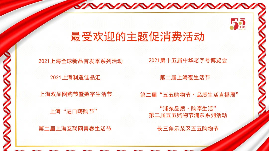(二)联动范围更广。一是联动全国消费促进月。2021“全国消费促进月”与“五五购物节”启动仪式合并举行。中央电视台连线南京东路和陆家嘴商圈,展示数字化转型消费新场景和“零时差”买遍全球消费新体验。东方卫视举办全球大直播,全国收视率排名第二。二是“四大品牌”联动促消费。“品质生活直播周”组织500余场活动,7亿多人次在线浏览观看,活动数量、辐射范围、参与人次远高于去年。上海制造佳品汇发布“设计100+”“时尚100+”“品牌100+”榜单,推出1000余个新品,实现销售超100亿元。信息消费节举办108场消费促进活动,“线上直播+线下路演”触达1100万市民,拉动消费超350亿元,同比增长29%。市文旅局推出“乐嗨上海”高品质文旅活动,“五一”假期本市共接待游客1689万人次,同比增长1.39倍,拉动消费约400亿元。首届“2021上海健康消费节”组织20家医药流通企业集中举办60余场健康消费系列活动,8家世界500强企业发起“家庭健康春风行动计划”。三是联动长三角促消费。中华老字号博览会设立长三角专区,194家长三角知名老字号企业参展,数量比去年翻一番。五个新城与长三角兄弟城市联合举办促消费活动,如嘉定与昆山、太仓成立“嘉昆太”诚信商业联盟,举办长三角非遗文化购物节等;青浦与吴江、嘉善共同举办“长三角生态绿色一体化发展示范区‘五五购物节’”,推出148场活动;松江打造长三角G60科创走廊“‘松江制造’品牌秀”,8大品牌新品首发;奉贤与杭州拱墅区、南京建邺区举办长三角品质市集,美谷美购江苏首店落户常熟。四是联动内外贸促消费。放大进博会溢出带动效应,以进口商品为主题举办“进口嗨购节”,组织进博会“6+365”交易服务平台和四大采购商联盟等30家重点企业,推出670场主题活动,2个月活动期间进口商品销售成交超过105亿元。其中,“进博商品集市”首次亮相南京路步行街,接待消费者近60万人次;国别商品文化缤纷月期间,“丝路音乐节”、“希腊、中东美食节”、阿塞拜疆“火焰之国”文化周等轮番上演;“进口购物季”系列活动,销售额81.3亿元,同比增长21.2%;继续打响“出海优品 云购申城”活动品牌,支持适销对路的外贸产品开拓国内市场,实现销售额同比增长近20%。