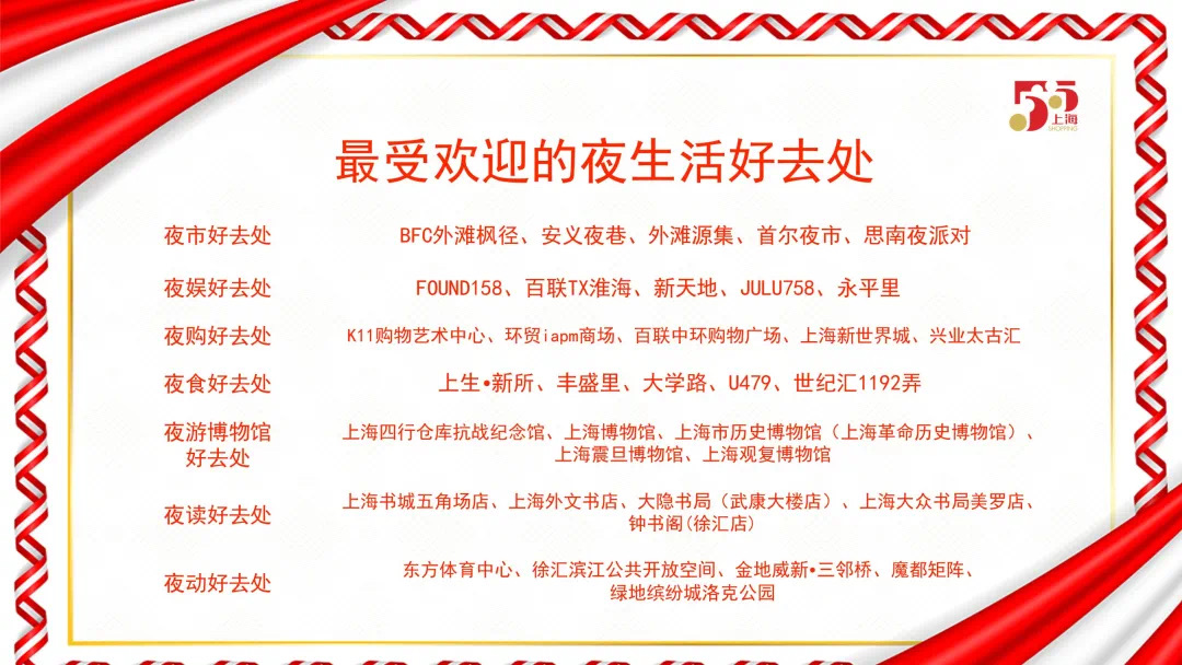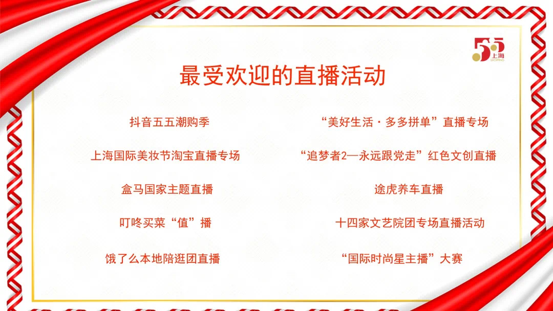 (五)宣传力度更大。在市委宣传部和市政府新闻办等支持下,“五五购物节”宣传报道覆盖面更大。一是全媒宣传引发热烈反响。人民日报、新华社、中央广播电视总台等中央媒体,解放日报、文汇报、新民晚报、上海广播电台等地方媒体,中国政府网、上海发布等政府平台及各区融媒体中心,开展了全方位、矩阵式、立体化的深入报道。初步统计,“五五购物节”纸媒报道1000余篇,其中头版和重要版面报道400余篇;电视报道400余次,广播电台报道300余次;据人民网网络舆情监测数据,全网报道超过10万篇。二是氛围营造铺天盖地。上海地标建筑、35处主要商业路段、70个主要商圈、万余部出租车后屏、6万余个公益阵地等,宣传展示购物节形象标识。地铁2号线推出“五五购物节”专列。今日头条、抖音发起购物节专属话题,总计触达40亿人次。小红书通过开屏、热搜、信息流等推荐购物节,线上曝光量6.2 亿次。三是“五五购物节”成果榜单首次发布。发布1份五五购物节成果报告;“最受欢迎主题促消费活动”、“最受欢迎品牌新品首发活动”、“最受欢迎夜生活好去处”、“最受欢迎直播活动”、“最受欢迎消费地标(商圈)”等五大榜单。