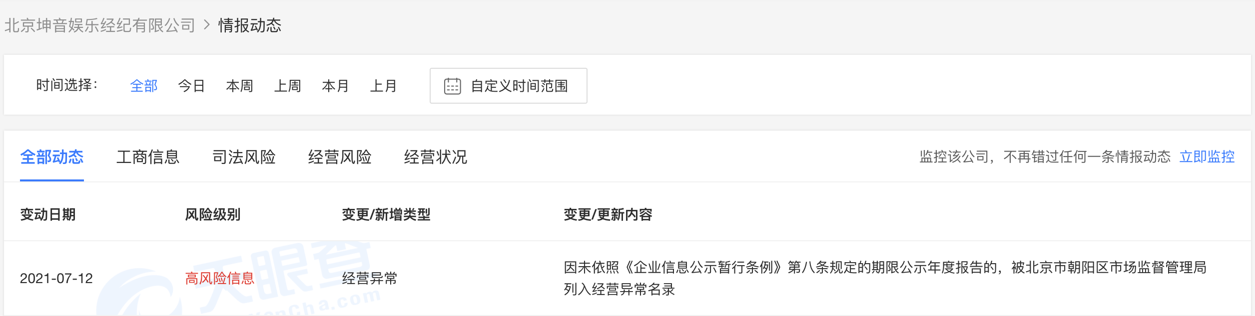 据天眼查APP显示,7月12日,坤音娱乐关联公司北京坤音娱乐经纪有限公司因未依照《企业信息公示暂行条例》第八条规定的期限公示年度报告的,被北京市朝阳区市场监督管理局列入经营异常名录。