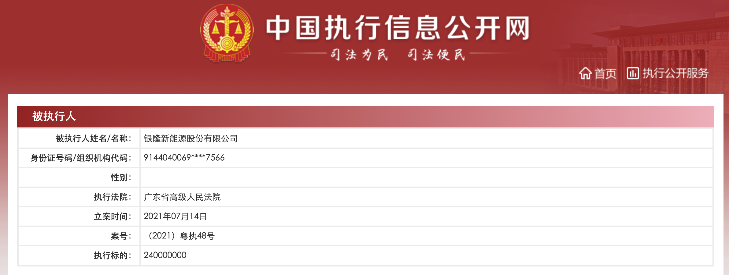 中国执行信息公开网消息,7月14日,银隆新能源股份有限公司新增一条被执行人信息,案号(2021)粤执48号,执行标的240000000元,执行法院为广东省高级人民法院。据天眼查APP显示,该公司第二大股东为董明珠,持股比例约为17.46%。