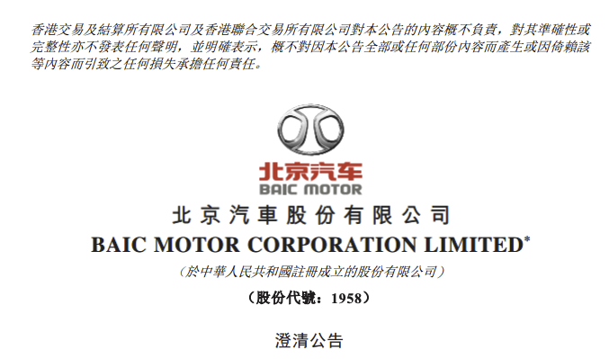 7月15日午间,北京汽车在港交所发布澄清公告称,公司注意到若干有关本公司可能首次公开发行A股股票之媒体推测以及本公司股份近期之价格及成交量有所上升。公司猜测有关报导来自于中信建投证券股份有限公司于2021年6月向北京证监局报送对本公司的第二十三期辅导工作报告。递交辅导工作报告仅为提供本公司在将来A股上市的选择但不代表本公司目前有计划A股上市。于本公告日期,除以上所述,本公司并不知悉有关报导之任何相关资料。