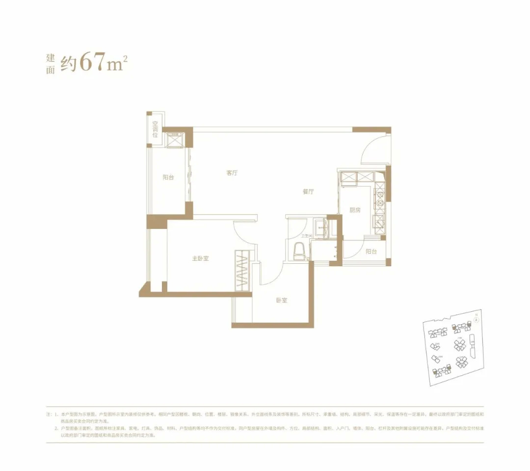 而勤诚达四期的最小的67平方米户型被设计成两房两厅一卫,还拥有两个阳台,空间利用合理,没有浪费。
