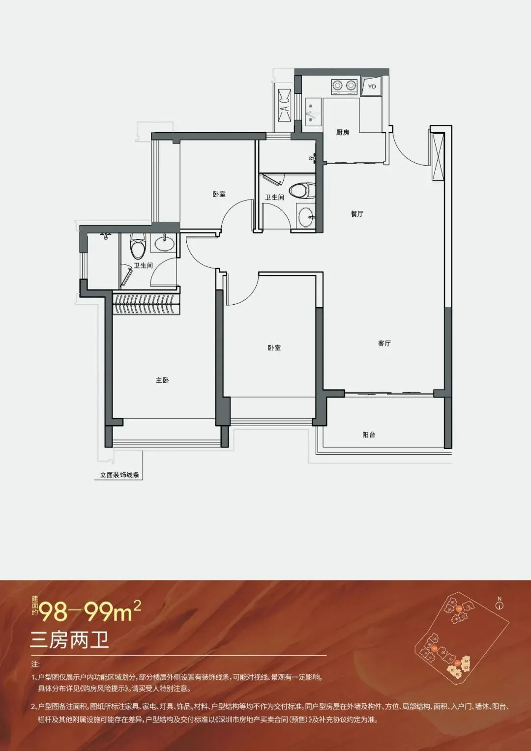 从这两个新盘最小户型图来看,星河三期98平方米的房源被设计三房两厅两卫,户型方正。