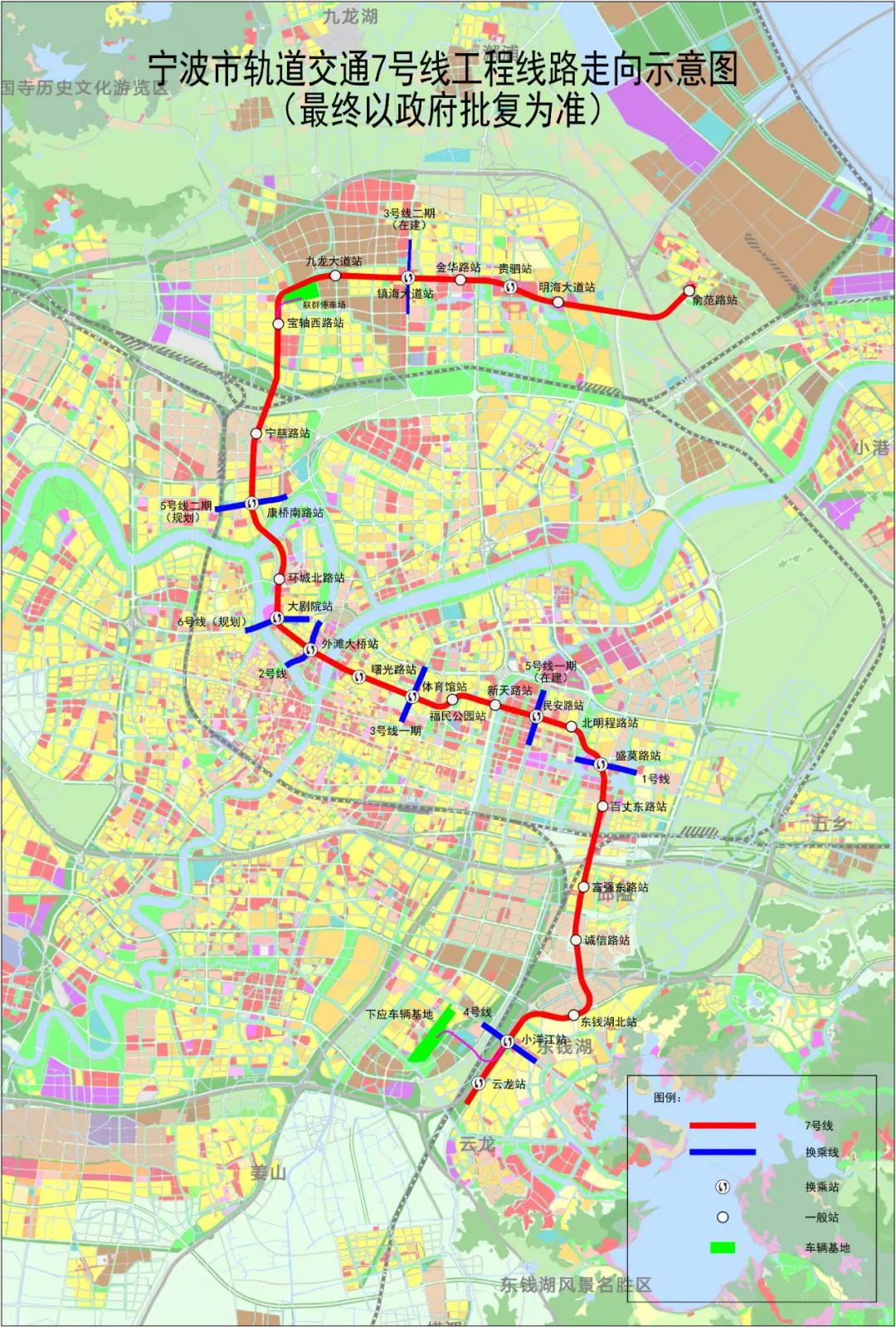 7号线为南北方向的市区线,线路南起东钱湖地区,穿越东部新城、老外滩、湾头、庄桥、镇海新城,最终到达俞范组团,分担城市南北向发展的客流。线路全长约39.4km,全线采用地下线形式敷设,设车站25座,设一段一场。