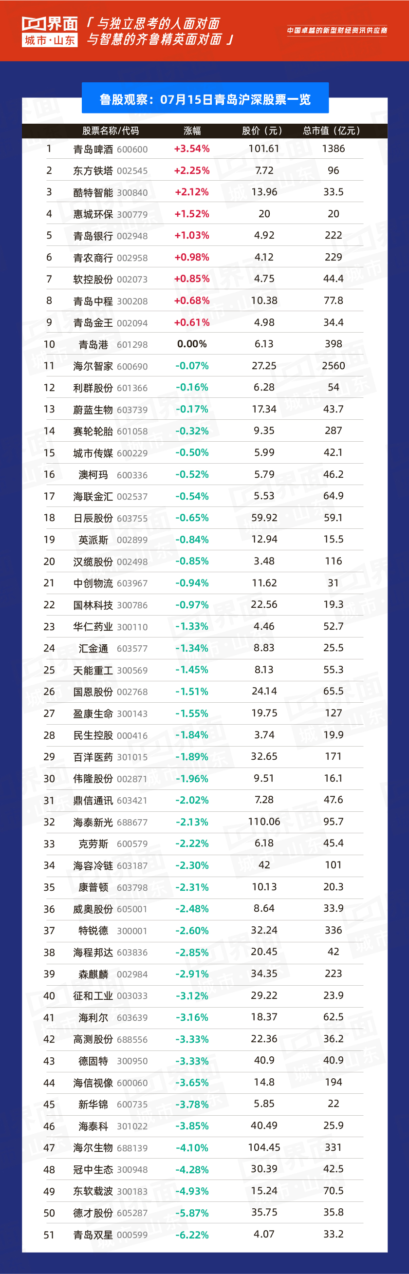 7月15日,山东79股上涨,4股持平,164股下跌。