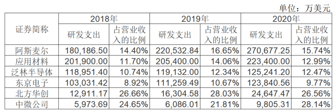 《英才》记者统计了各半导体设备公司近三年的研发投入情况,中微公司2020年的研发支出仅为北方华创的40%,仅为两大龙头公司阿斯麦尔和应用材料的4%。