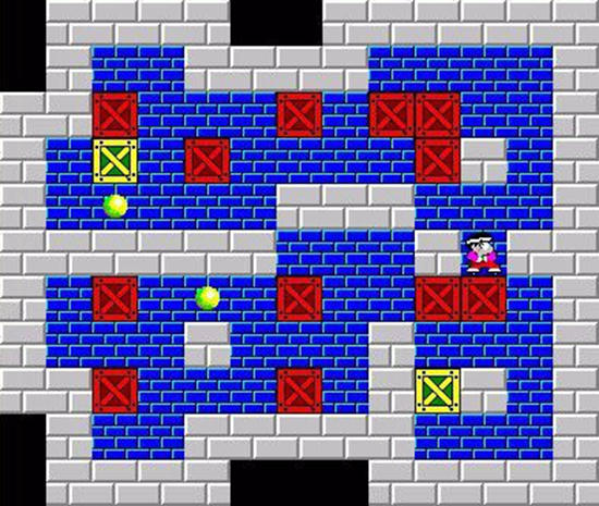 在这个游戏里,我们通过方向键控制屏幕里那个脸超大的人(我们暂且亲切地称他为小松),让他上下左右去推箱子。我们自然毫不关心他推箱子推得无聊不无聊累还是不累,我们只关心如何才能让他把这些破箱子快点推到相应的点位上去。