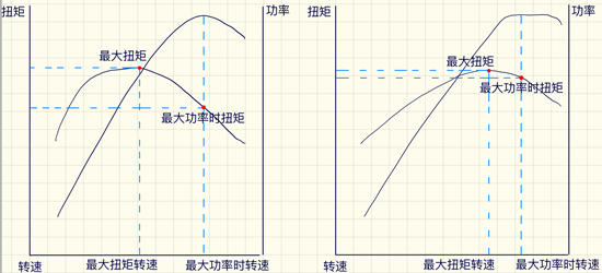比较两台发动机,最高扭矩/最高功率时的扭矩、达到最高功率时的转速/达到最高扭矩的转速两个比值越接近1的发动机动力性越好。作比较时,一般可以看发动机的功率扭矩曲线图,找到「最高扭矩」点和「最高功率」时发动机输出的「扭矩」的点。两个点靠的越近,发动机的动力性就更好。所以下图中,两个发动机的功率和扭矩虽然基本一致,但是右图所示的那台发动机的动力性会更好。而左图那台发动机因为低转速时扭矩更足会更加适合城市工况驾驶。