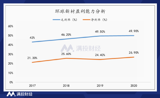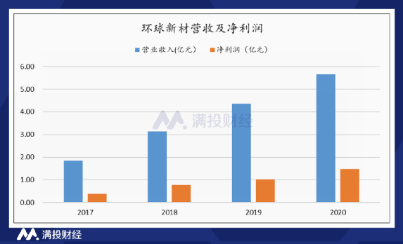 根据招股说明书数据显示,2017年-2020年,环球新材的营业总收入分别为人民币1.84亿、3.14亿、4.36亿、5.65亿,年均复合增长率高达32.38%。期间实现净利润分别为3902万元、7740万元,1.02亿元、1.48亿元,年均复合增速高达39.59%。虽然从营收规模上看公司规模相对较小,但业绩增长速度却非常高,其盈利能力持续处于高速增长通道中。