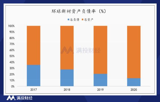 从负债情况上来看,2017年-2020年,环球新材的资产负债率分别为54.58%、38.94%、25.82%、15.49%,负债比率呈现持续缩减的走势,资产稳定性极佳。