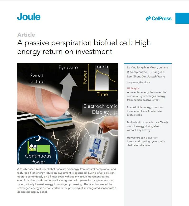 这项研究于7月13日以一篇论文的形式发表在Joule杂志上,题目为A passive perspiration biofuel cell: High energy return on investment。