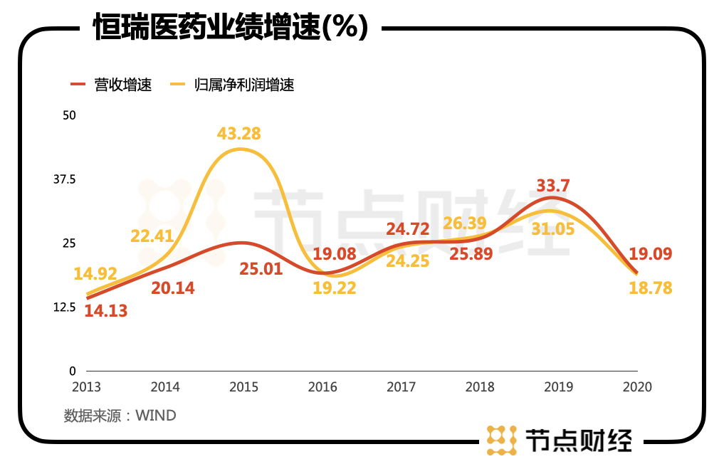 业绩上,2020年,恒瑞医药营收和归属于母公司的净利润分别同比增长19.09%、18.78%,增速均创出近年来新低。