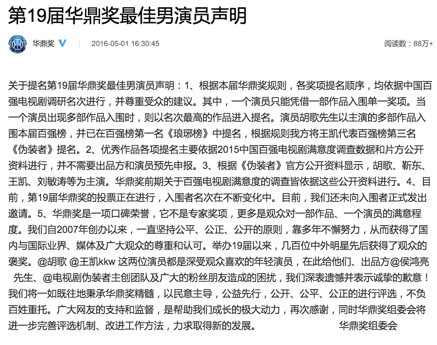 但这一回应却引起了剧迷、艺人粉丝对华鼎奖由来、奖项规则的关注。实际上,去年,网友@踏浪之帆就曾在微博上发布过一篇名为《华鼎奖到底有多奇葩?!》的文章。