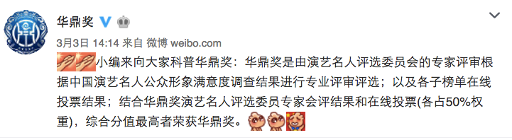 此外,华鼎奖公开资料中评奖规则第24条写明:消费者、观众投票后,选票全交委托的第三方机构会计事务所加以统计;其官方微博3月3日发布的排名规则称,艺人的综合分值来自评选委员专家的会评结果和在线投票,两者各占50%权重,分值最高者获奖。