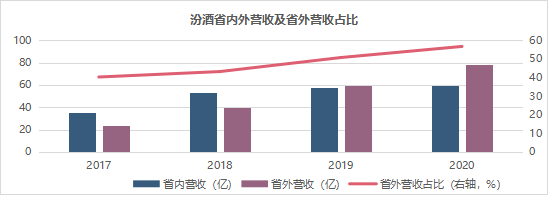 对于汾酒的高速成长,除了高端化以及自身品牌势能不断提高外,不断扩展省外市场,进行渠道改革也是重要原因之一。