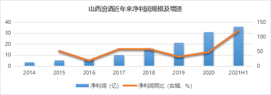 上半年,汾酒预计营收与上年同期相比增加48.30亿元—55.20亿元,预计营业收入117.29亿元—124.19亿元,同比将增加70%—80%;净利增加17.66亿元—20.87亿元,预计将实现33.70亿元—36.91亿元,即使按最低33.70亿元计,也已经超越2020年全年。