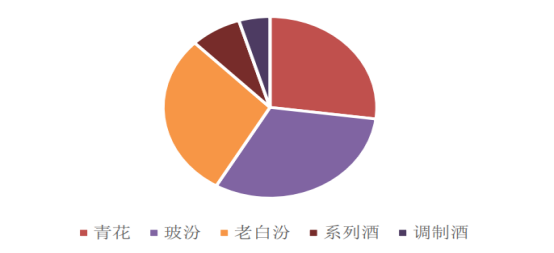 当前汾酒已经形成了“青花汾酒+玻汾+老白汾+系列酒+配制酒”的大单品格局,品类涵盖高中低档价格带。系列酒主要是指杏花村,配制酒则是保健酒竹叶青。下面是2019年汾酒各大业务营收占比图,可见青花汾酒、玻汾、老白汾对营收贡献非常大。