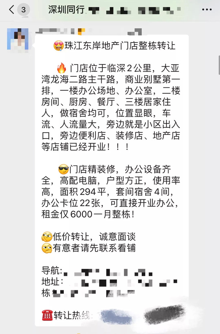 7月12日,燃财经在深圳的房产中介微信群中看到,有人转让大亚湾区一中介门店,转发消息的就是该门店员工,她表示,“合伙人不想做了,老板自己转让。”她还在群里求工作介绍,“房地产做久了,不知道还能做什么。”