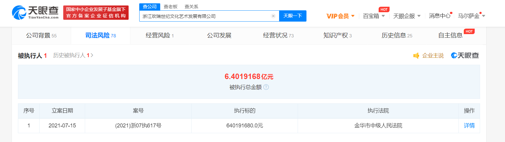 据天眼查APP显示,7月15日,浙江欢瑞世纪文化艺术发展有限公司被金华市中级人民法院列为被执行人,执行标的640191680元,案号(2021)浙07执617号。关联案件为欢瑞联合(天津)资产管理合伙企业(有限合伙)相关案件。