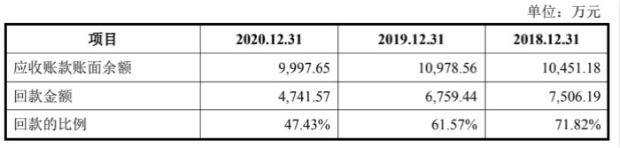 这也将导致,应收账款的回款难度进一步上升,招股书显示,永信至诚2019年、2020年一年内的应收账款比例分别为55.61%、57.54%,有四成以上的应收账款在1年期以上,其报告期回款比例也从71.82%降至61.57%,并进一步降至47.43%,回款难度攀升。