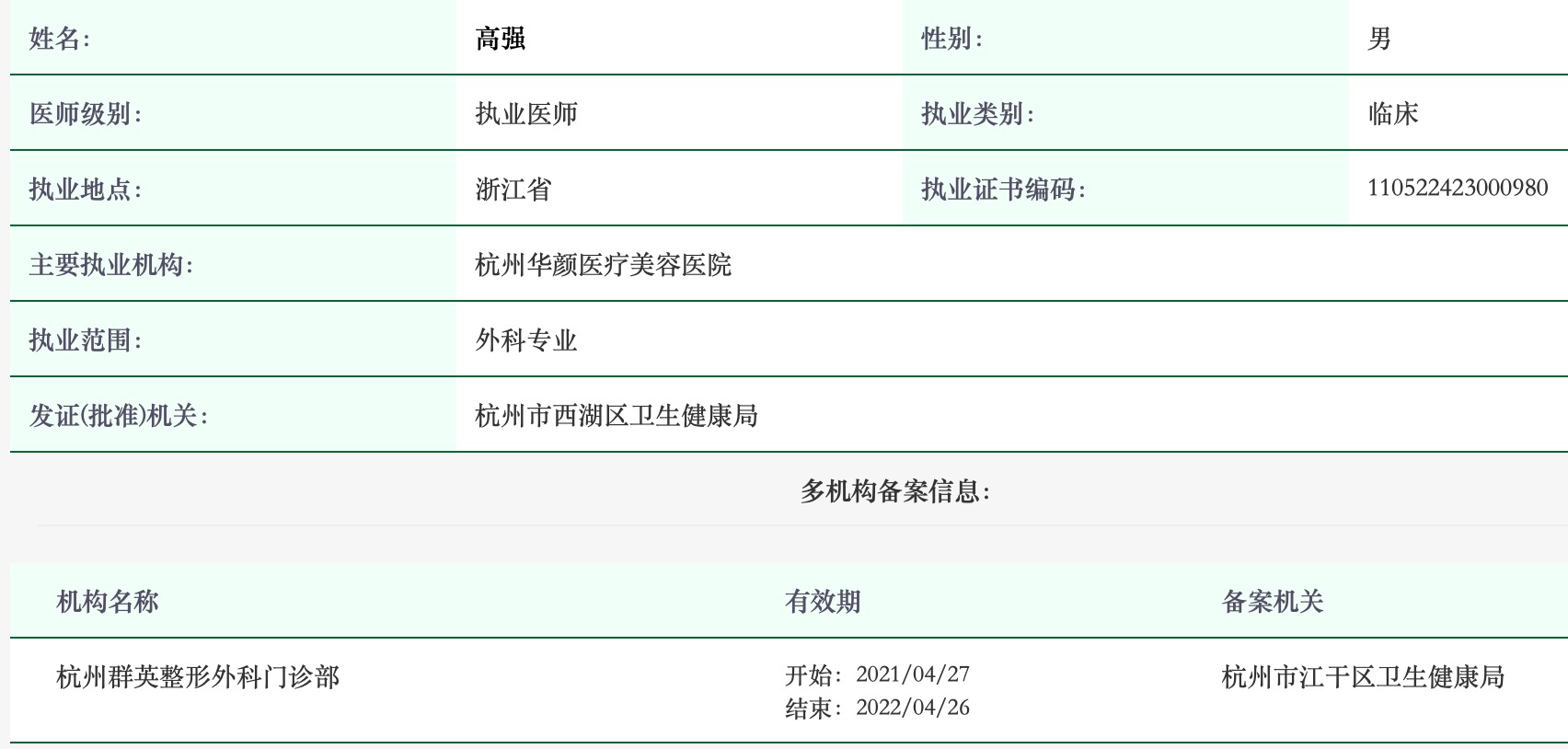 涉事医院的官方微信公众号显示,高强担任中国整形美容协会会员、中国整形美容协会脂肪医学分会会员等多个职位,擅长的领域为黄金魔术脂雕、自体脂肪填充等。