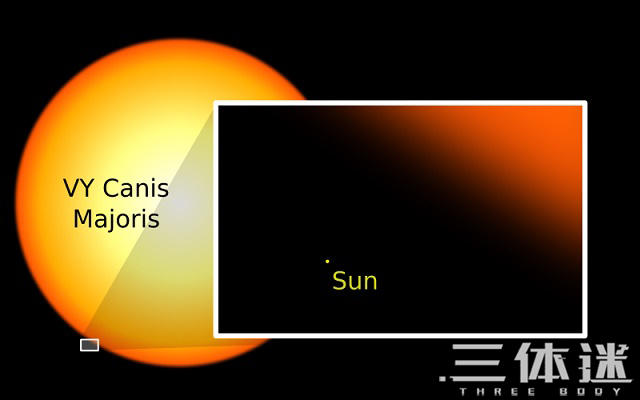 把太阳放在大犬座VY旁边,要用放大镜才能找到它: