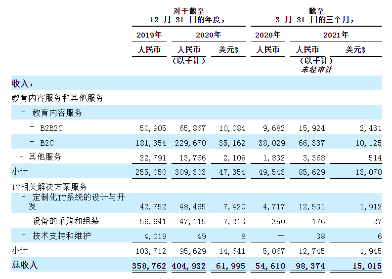 招股书显示,2019年,见知教育的年度总收入为3.589亿元人民币,其中来自教育内容服务的收入为2.551亿元人民币,来自IT相关解决方案服务的收入为1.037亿元人民币;2020年,见知教育的年度总收入为4.049亿元人民币,其中来自教育内容服务的收入为3.093亿元人民币,来自IT相关解决方案服务的收入为0.956亿元人民币。