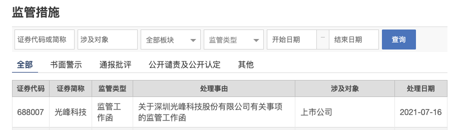 7月16日,上交所就光峰科技有关事项下发监管工作函,涉及对象为上市公司。