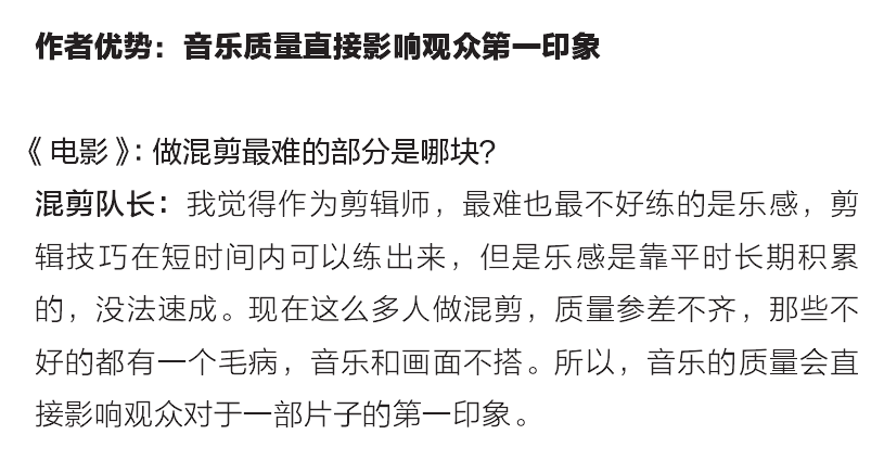 创作者“混剪队长”曾采访中表示,“对自己的乐感特别自信,这是他创作混剪的优势”、“音乐的质量会直接影响观众对于一部片子的第一印象”。