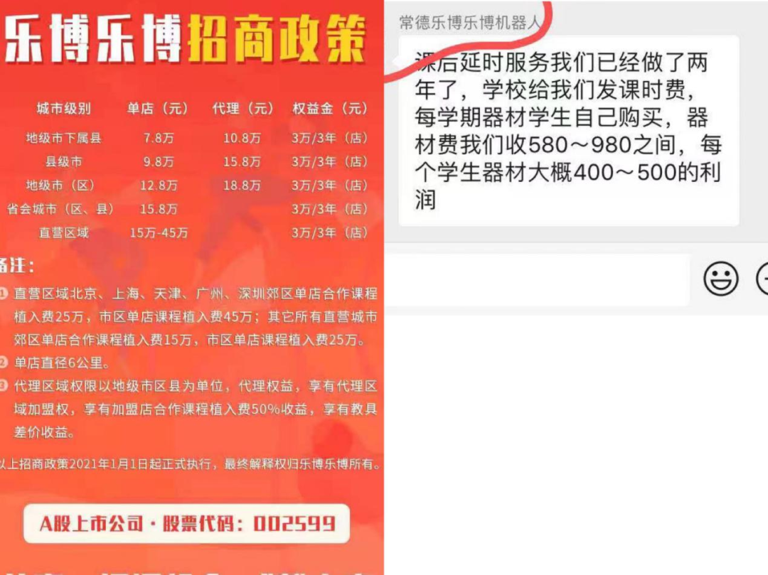据乐博乐博加盟负责人向锌刻度透露,加盟商购买编程机器人可享受优惠代理价,“有江苏常州的一位加盟商,进入了当地的中小学公立校,(卖)教具赚了不少。”该负责人向锌刻度展示的案例中,一位常德的加盟商与当地学校达成了合作,“学校给我们发课时费,每学期器材由学生自己购买,器材费我们收580元-980元之间,每个学生器材费大概400元-500元的利润。”