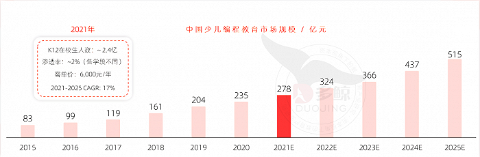 根据多鲸教育研究院研究,当前各年龄段平均渗透率接近 2%。以 K12 在校生人数 2.4 亿、平均客单价 6000 元计算,2021 年各年龄段合计市场规模达 278 亿。未来 4 年保持 17% 的增速情况下,市场规模有望在 2025 年超过 500 亿。