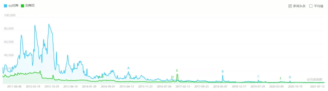 《QQ炫舞》(蓝色)和《劲舞团》(绿色)百度指数