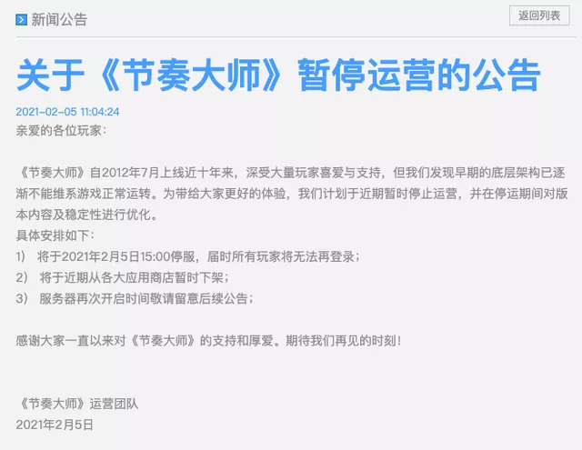 《节奏大师》官方停服公告