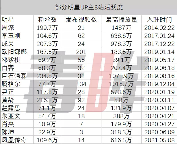 在B站明星UP主中,腾格尔无论是投稿视频数量还是最高视频播放量,都位居头部。