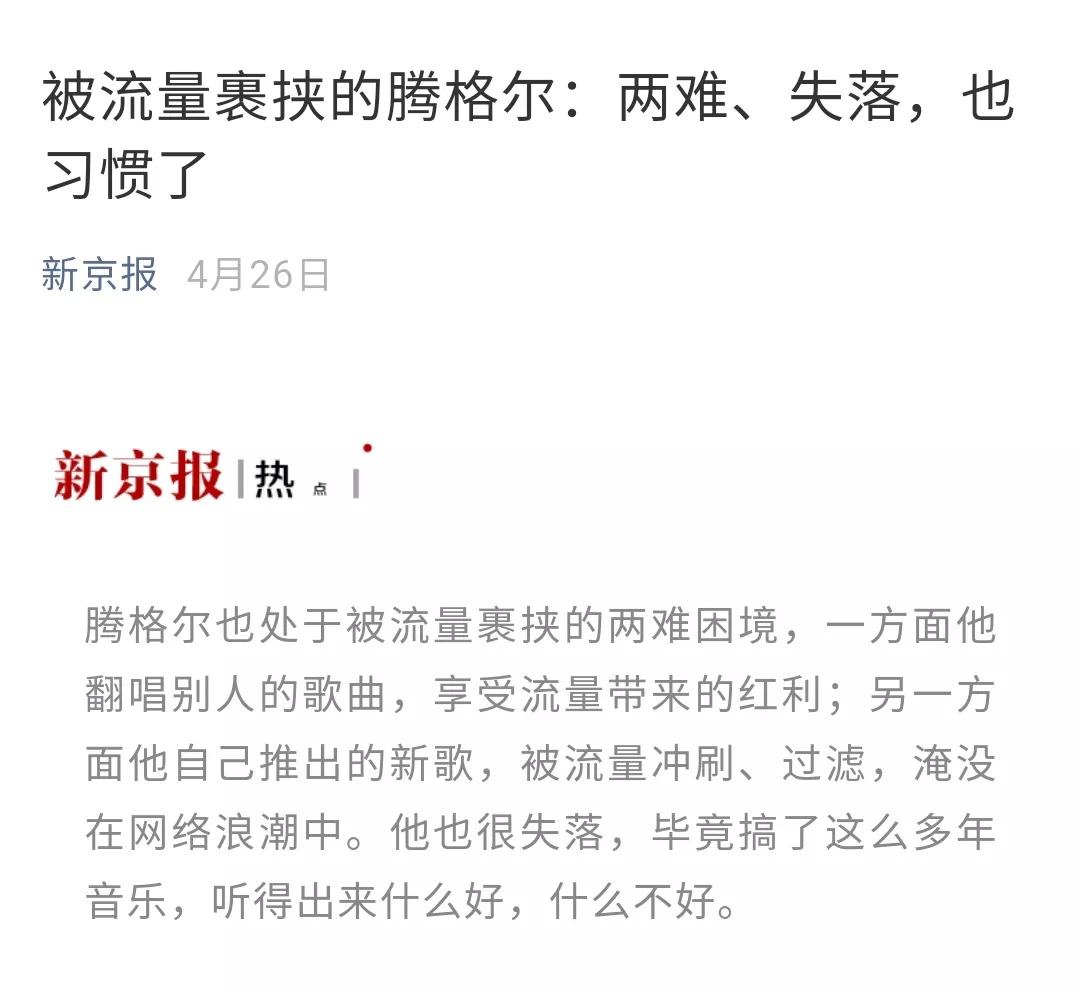 对于一个歌手来说,靠翻唱走红未必是想要的结果,曾以《天堂》《蒙古人》等草原歌曲闻名的腾格尔难以理解时下网红歌曲的走红逻辑,“究竟哪儿美了?”腾格尔表示疑惑。