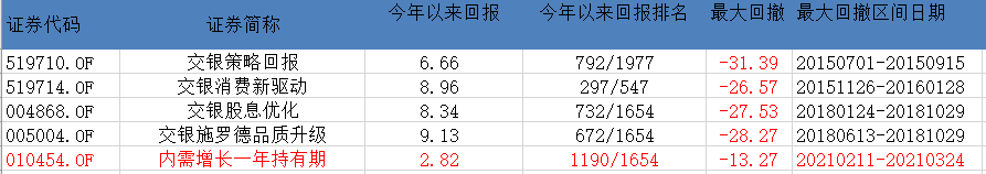 除了新基内需增长外,其余四只老基金今年以来业绩同样一般。其中,品质升级回报达9.13%,同类中排名672/1654。交银策略回报今年以来回报为6.66%,同类排名792/1977。