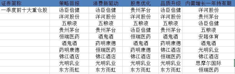 界面新闻记者统计发现,截至一季度末,五只基金的前十大重仓股中,配置比例均为食品医疗、医药生物、休闲服务、建筑材料等行业。其中,食品饮料中有贵州茅台(600519)、洋河股份(002304)、五粮液(000858)、酒鬼酒(000799)等4只白酒股、光明乳业(600597)、汤臣倍健(300146)两只食品股、医药生物中则对恒瑞医药(600276)情有独钟,建筑材料中则青睐东方雨虹(002271)。