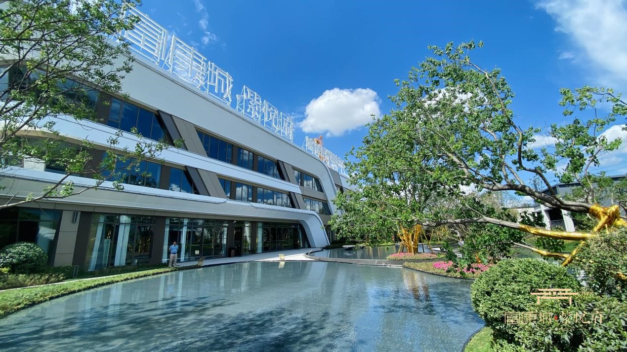 富康城·紫悦府城市绿洲体验中心以大水体景观、大面绿植及时尚现代的建筑风格描绘出“府”系未来生活的场景,以“森系”理念表达对城市发展及自贸人居的深刻理解。