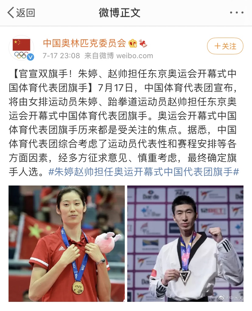 北京时间2021年7月17日晚,中国奥林匹克委员会发布官方微博宣布,将由女排运动员朱婷、跆拳道运动员赵帅担任东京奥运会开幕式中国体育代表团旗手。