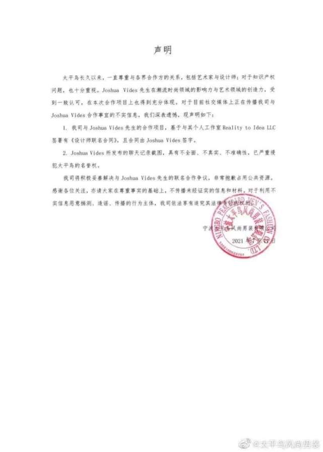 太平鸟男装强调:“我司与Joshua Vides先生的合作项目,基于与其个人工作室Reality to Idea LLC签署有《设计师联名合同》,且合同由Joshua Vides签字;Joshua Vides所发布的聊天记录截图,具有不全面、不真实、不准确性,已严重侵犯太平鸟的名誉权。”
