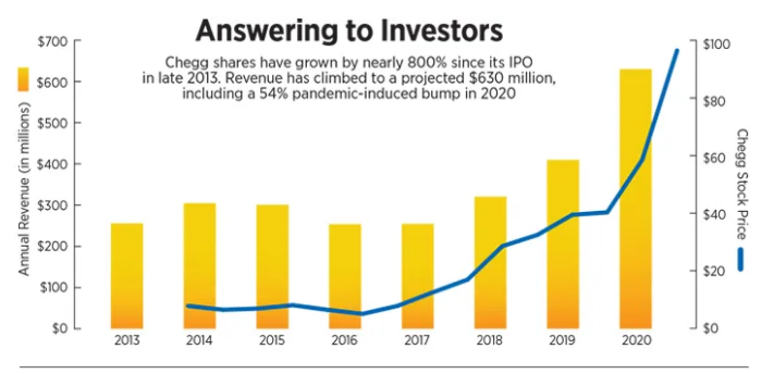 近期,Chegg预计今年的净收入将达到7.9亿至8亿美元。2021年第一季度,Chegg的non-GAAP(非美国通用会计准则)净收入为4640万美元,总净收入为1.984亿美元,公司估值已超120亿美元。