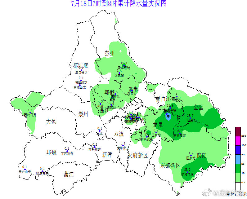 7月18日7时到8时成都市出现雷雨大风天气,成都市共计大于25毫米5站。雷雨大风出现在金堂、简阳、龙泉驿、青白江、四川天府新区和成都东部新区等地,最大瞬时风速在金堂高板杨溪18.5m/s(8级),其余区(市)县最大瞬时风速:成都东部新区石盘周家18.3m/s,青白江福洪壁山17.1m/s,简阳三星同合15.4m/s,龙泉同安同福12.3m/s。最大降水量出现在龙泉洪安35.3毫米。其余区(市)县最大降水量:简阳江源28.3毫米,金堂白果25.9毫米,一小时最强降水出现在龙泉洪安35.3毫米。
