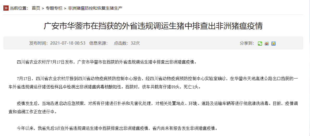 四川省农业农村厅网站7月18日消息,四川省农业农村厅7月17日发布,广安市华蓥市在挡获的外省违规调运生猪中排查出非洲猪瘟疫情。