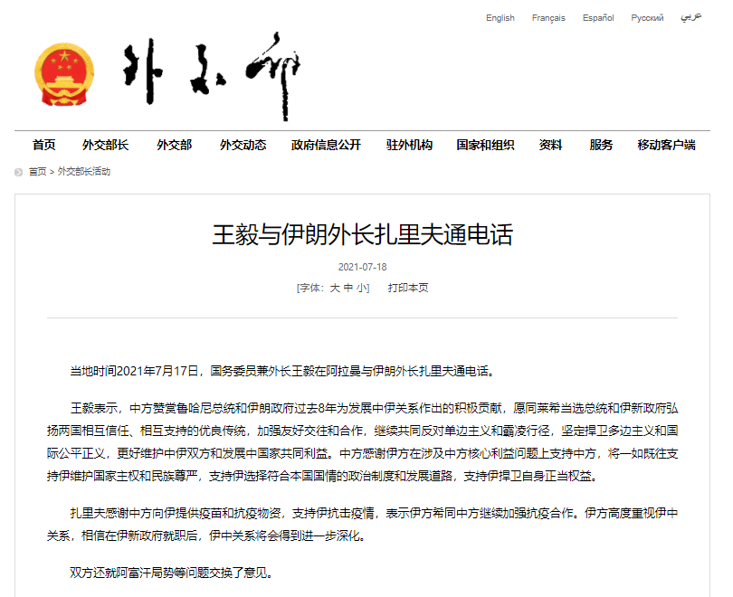 外交部网站消息,当地时间年7月17日,国务委员兼外长王毅在阿拉曼与伊朗外长扎里夫通电话。
