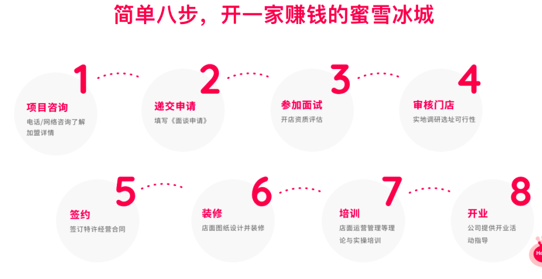 蜜雪冰城的加盟是一个很复杂的过程。根据蜜雪冰城的官网显示,蜜雪冰城的加盟需要八个步骤,在递交申请的页面还需要提交个人财产的证明。据一位招商人员向Tech星球透露,目前全国门店平均日营业额能达到3000左右,回本周期在一年以内。