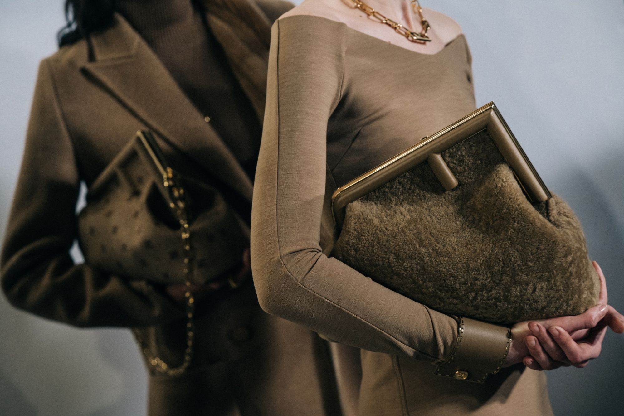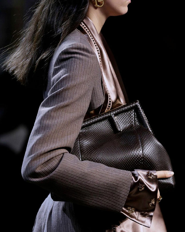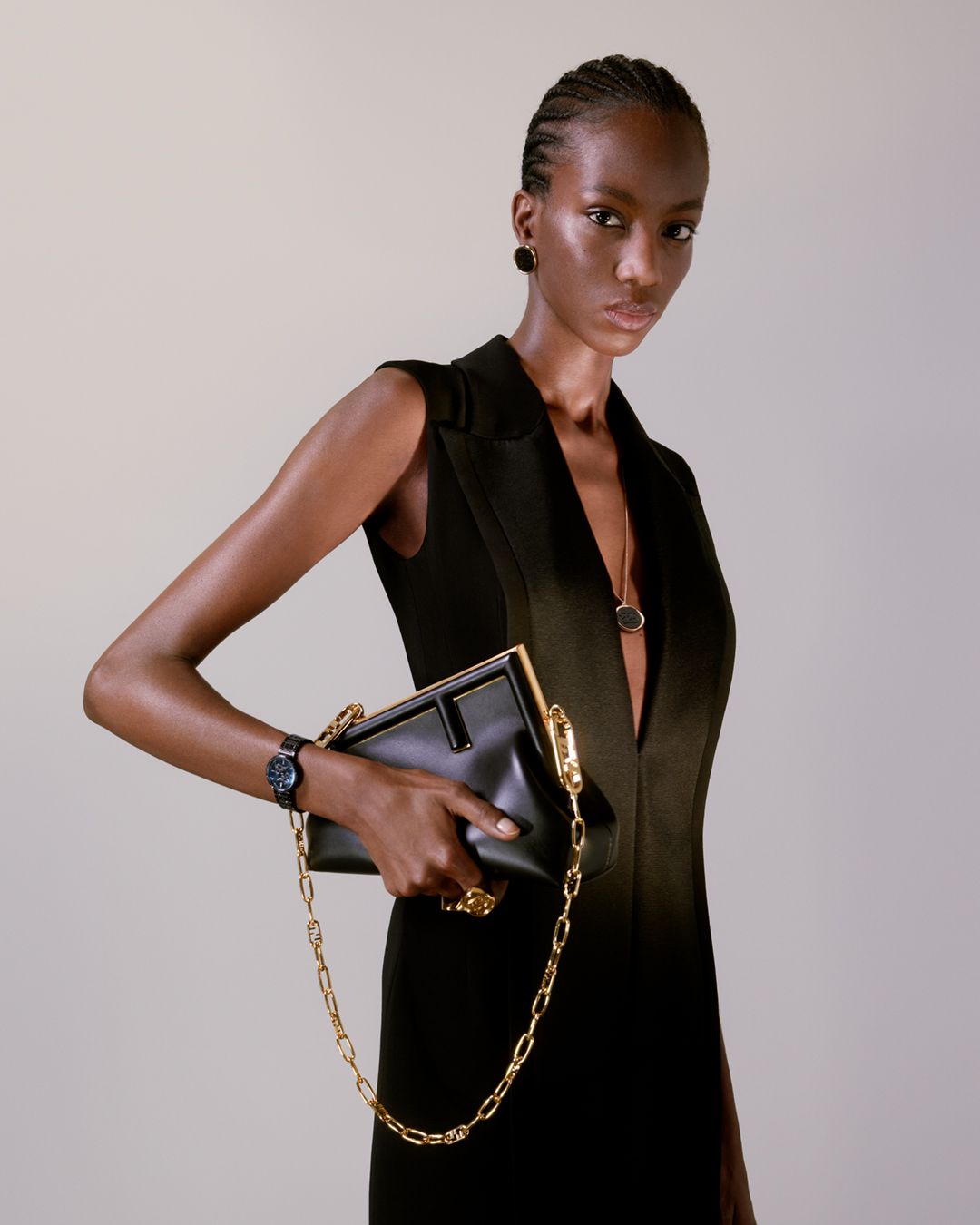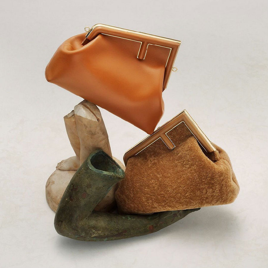 Kim Jones巧妙又大胆地将“F“字母的斜向廓形设计融入了本季FENDI FIRST系列手袋和鞋款,为品牌的“F” logo带来了别具巧思的优雅诠释,并且在极简与奢华间取得了巧妙平衡,令人眼前一亮。
