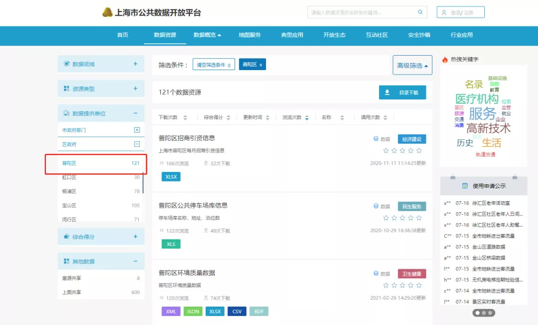 上海市公共开放数据平台上普陀区子栏目入口界面