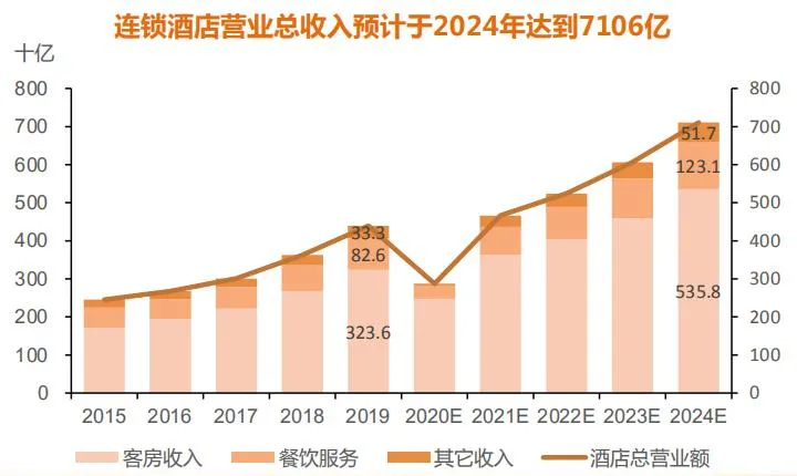 营收方面,2015年连锁酒店的市场规模为人民币2452亿元,近年来持续增长4年的年复合增长率为15.7%。经营总额于2019年达到人民币4395亿元,预计2024年营业总收入达到7,106亿元。