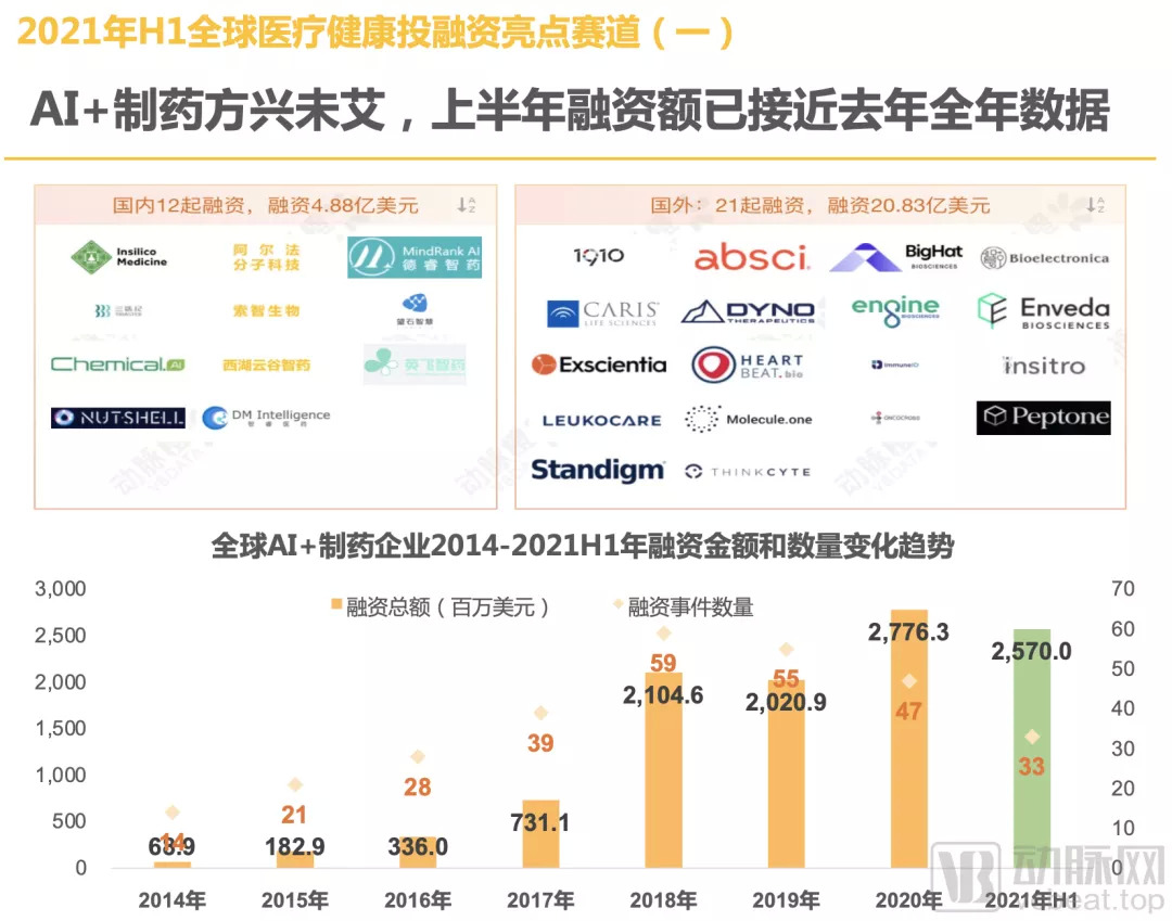 全球AI+制药赛道2021年H1发生33起交易,累计融资余额25.7亿美元,接近2020年全年融资额,以此趋势预估2021年融资额将很大可能创新高。